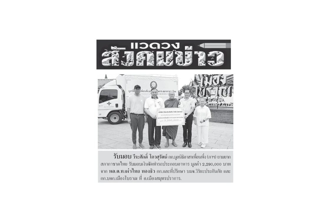 นายวีระศักดิ์ โควสุรัตน์ กรรมการมูลนิธิอาสาเพื่อนพึ่ง (ภาฯ) ยามยาก รับมอบเงินสนับสนุนในการจัดทำรถประกอบอาหาร จำนวน 2,290,00 บาท จาก พลตำรวจโท เผ่าไทย ทองธิว กรรมการและที่ปรึกษา บมจ.วิริยะประกันภัย และกรรมการ บจก.เมืองโบราณ...
