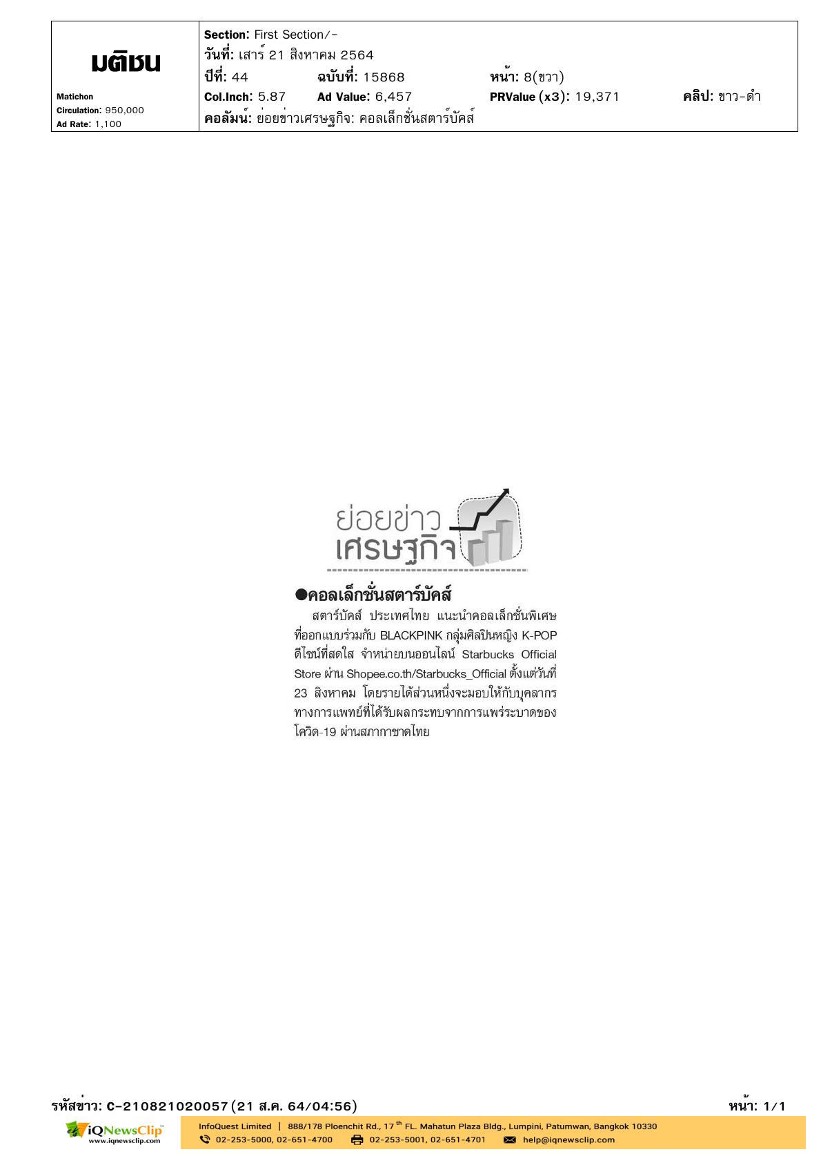 6บจก. สตาร์บัคส์ ประเทศไทย เตรียมเปิดขายคอลเล็กชั่นพิเศษ Starbucks x BLACKPINK ใน Starbucks Official Store บน Shopee โดยรายได้ส่วนหนึ่งมอบแก่บุคลากรทางการแพทย์ที่ได้รับผลกระทบจากโควิด-19 ผ่านสภากาชาดไทย