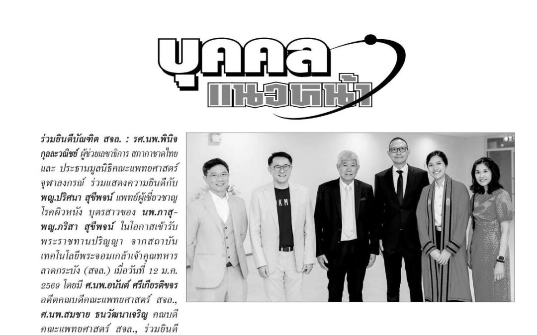 รศ.นพ.พินิจ กุลละวณิชย์ ผู้ช่วยเลขาธิการ สภากาชาดไทย ร่วมแสดงความยินดีกับ พญ.ปริศนา สุขีพจน์ แพทย์ผู้เชี่ยวชาญโรคผิวหนัง บุตรสาวของ นพ.ภาสุพญ.ภริสา สุขีพจน์ ในโอกาสเข้ารับพระราชทานปริญญา จากสถาบันเทคโนโลยีพระจอมเกล้าเจ้าคุณทหารลาดกระบัง (สจล.)