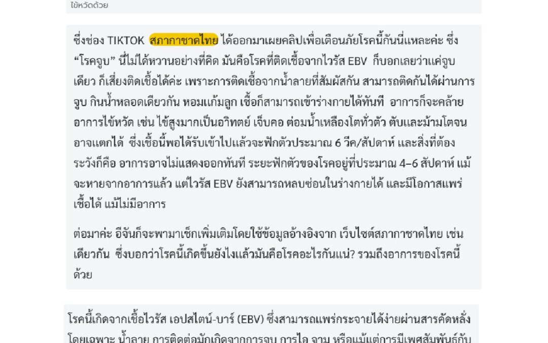 สภากาชาดไทย เตือนเเค่จูบเดียวก็เสี่ยงติดโรคโมโนนิวคลิโอซิส หรือ โรคที่ติดเชื้อจากไวรัส EBV ที่สามารถแพร่กระจายได้ง่ายผ่านสารคัดหลั่ง โดยเฉพาะน้ำลาย การติดต่อมักเกิดจากการจูบ การไอ จาม หรือแม้แต่การมีเพศสัมพันธ์