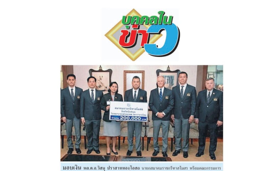 6นางระพีพรรณ หาญพงศาจิตต์ ผู้ช่วยผู้อำนวยการด้านบริการพิเศษ รพ.จุฬาฯ รับมอบเงินบริจาค จำนวน 200,000 บาท จาก พล.ต.อ.วิสนุ ปราสาททองโอสถ นายกสมาคมราชกรีฑาสโมสร พร้อมคณะกรรมการ เพื่อสนับสนุนการดำเนินงานของ รพ.จุฬาฯ ณ สมาคมราชกรีฑาสโมสร